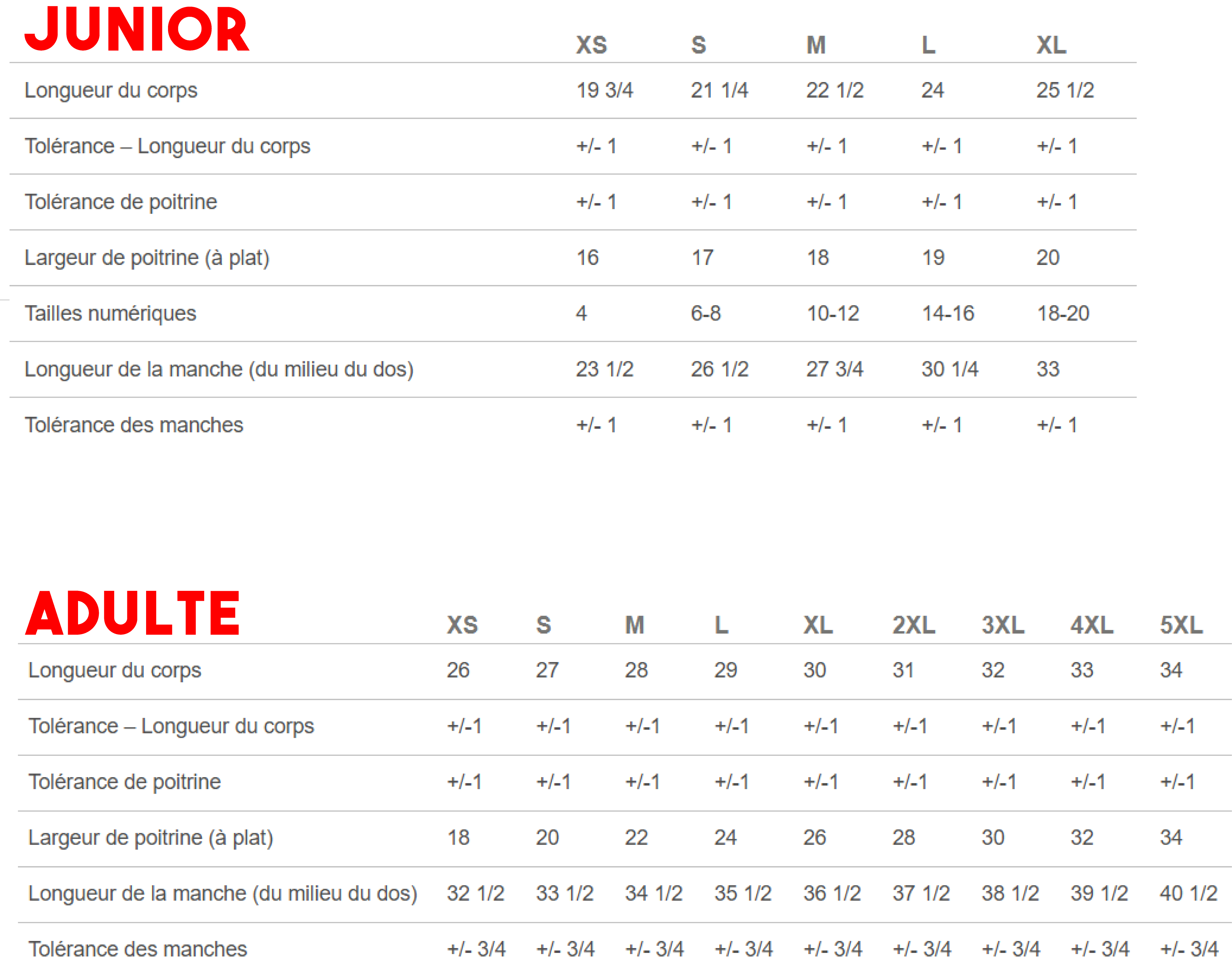 | Adulte | S, M, L, XL, 2XL, 3XL |